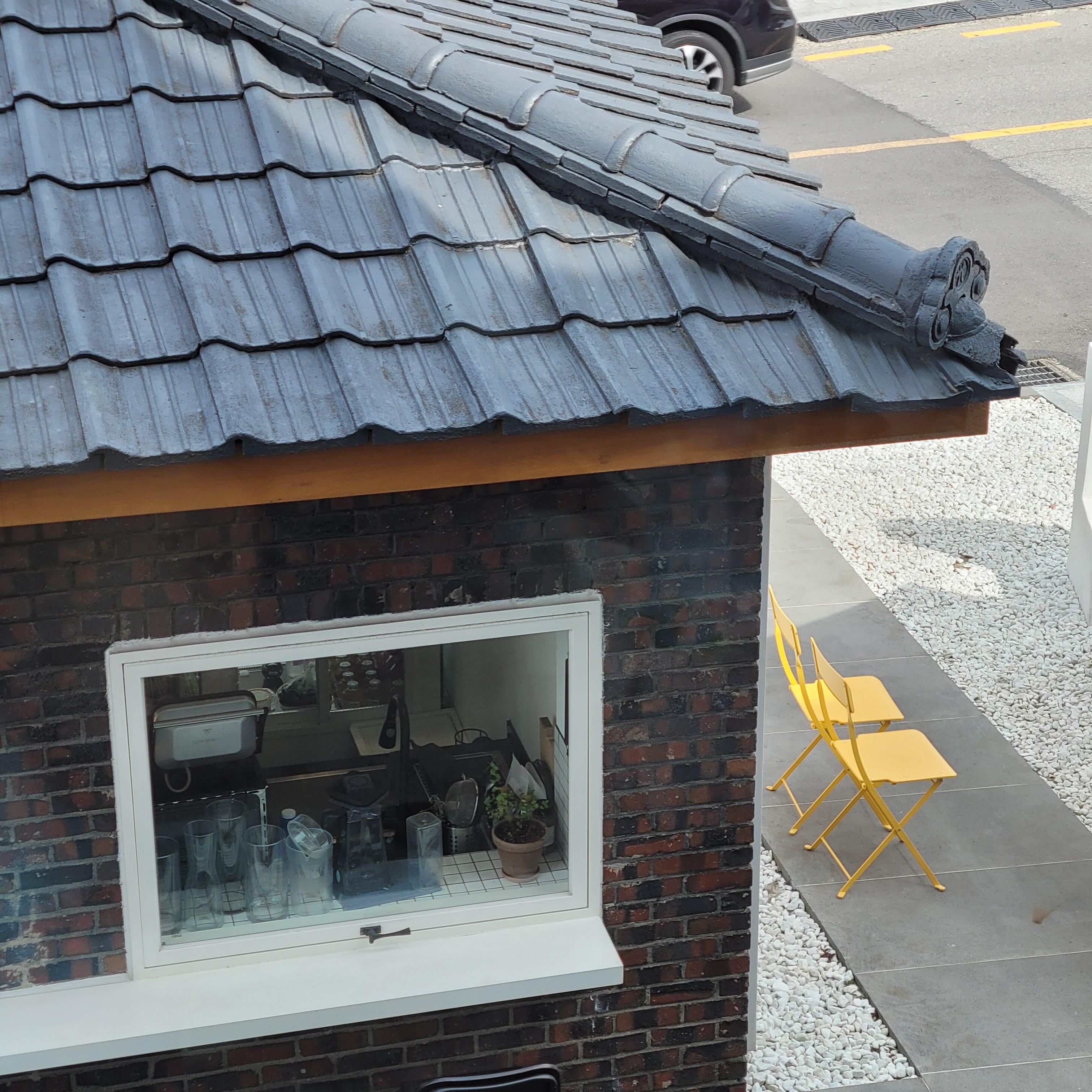 벽돌집에 기와 지붕, 노랑 의자라니.. 어울리지 않는 것들의 조화가 이뻐요.