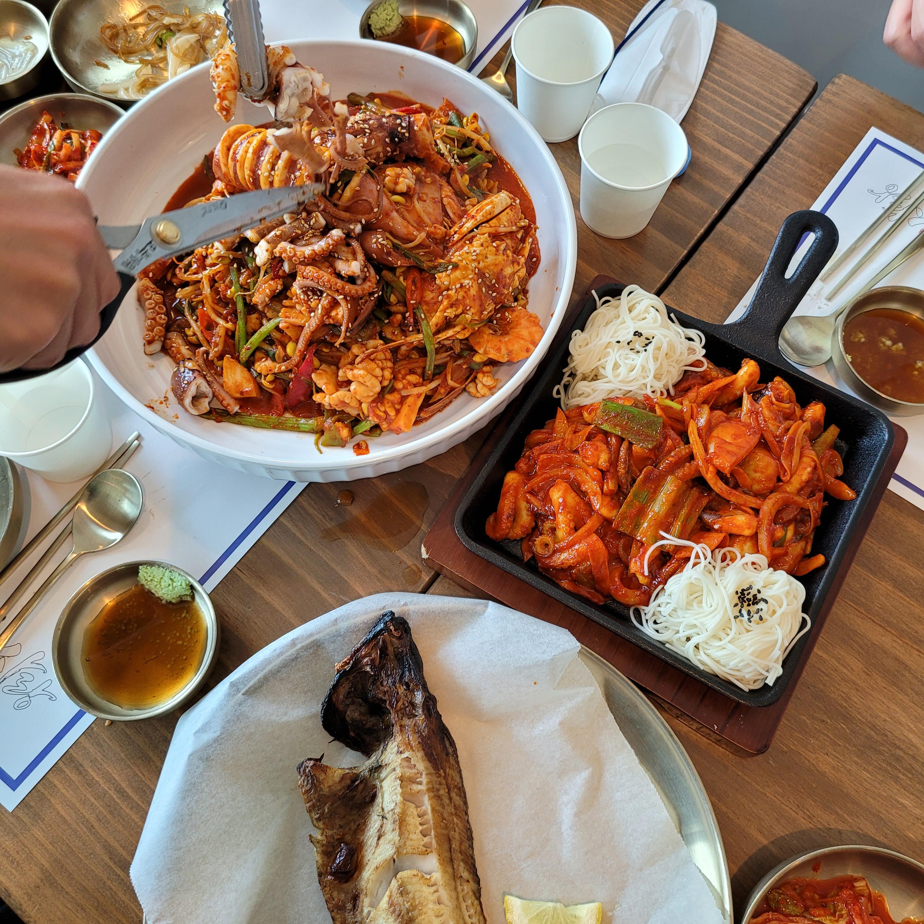 어른 5, 아이 2을 위한 #해물찜 중짜, #쭈꾸미볶음, #임연수 구이가 주문들어갑니다.
