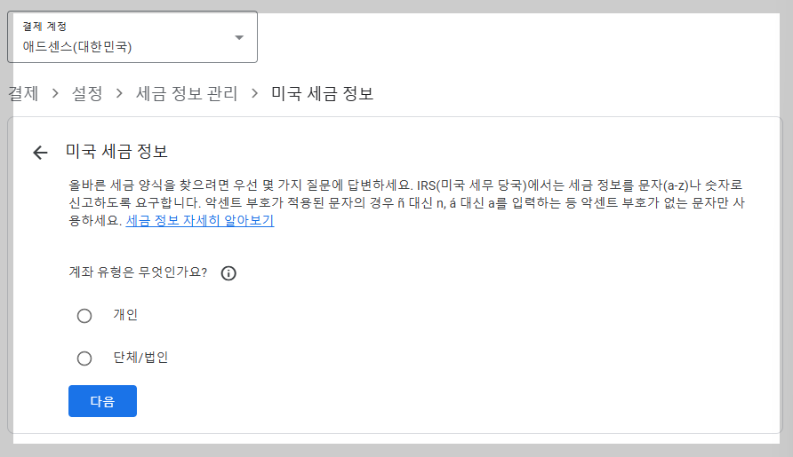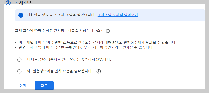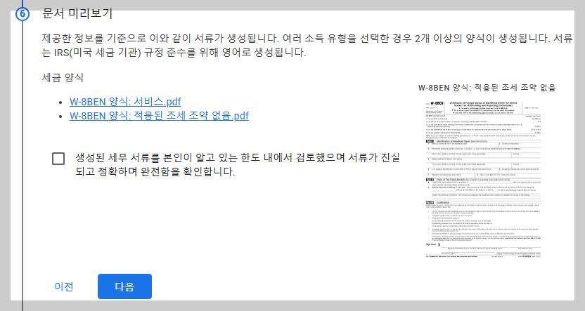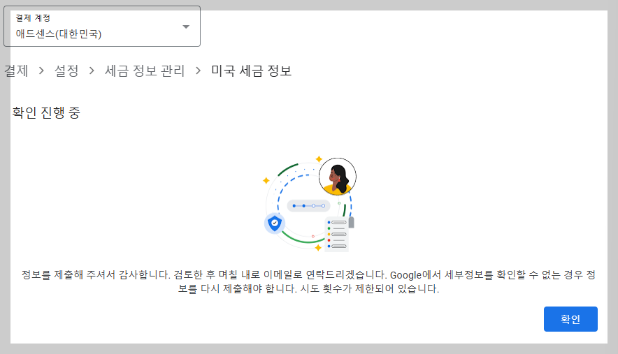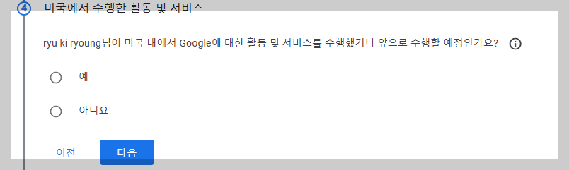 미국에서 애드센스로 수익을 올리는 활동을 했는지를 확인하는 단계라서