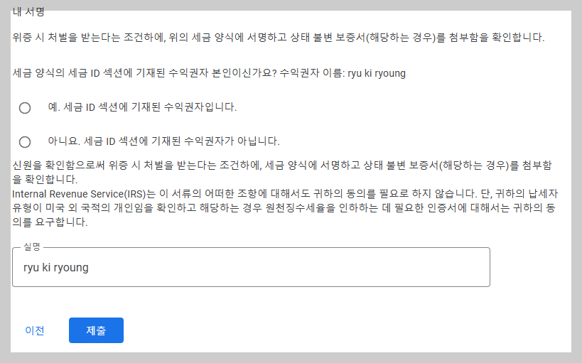 세금 ID에 기재한 사람이 나야.. 라고 '예, 세금 ID섹션에 기재된 수익권자 입니다' 라고 선택해주세요.