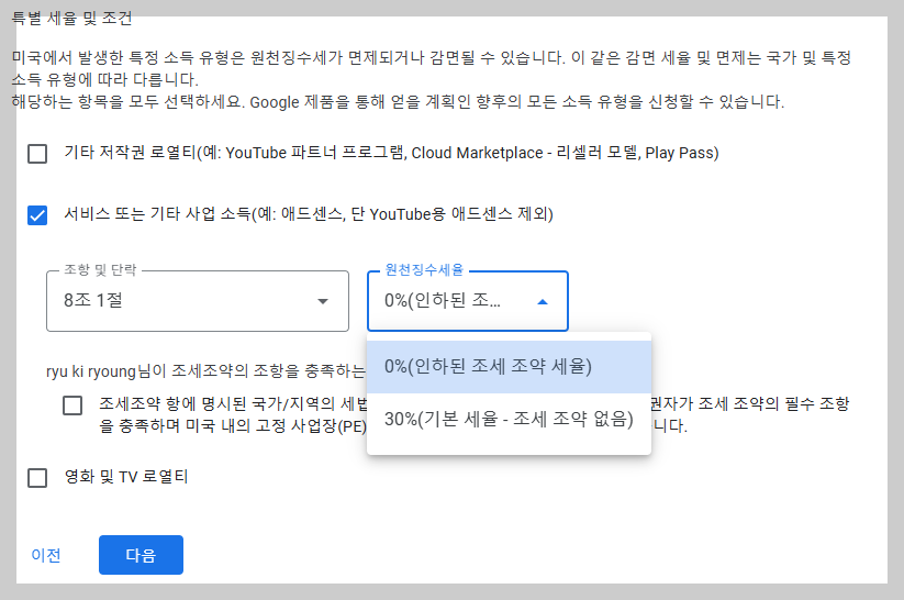 유튜브 수익이 있는 분은 '기타 저작권 로열티'까지 선택해주세요.