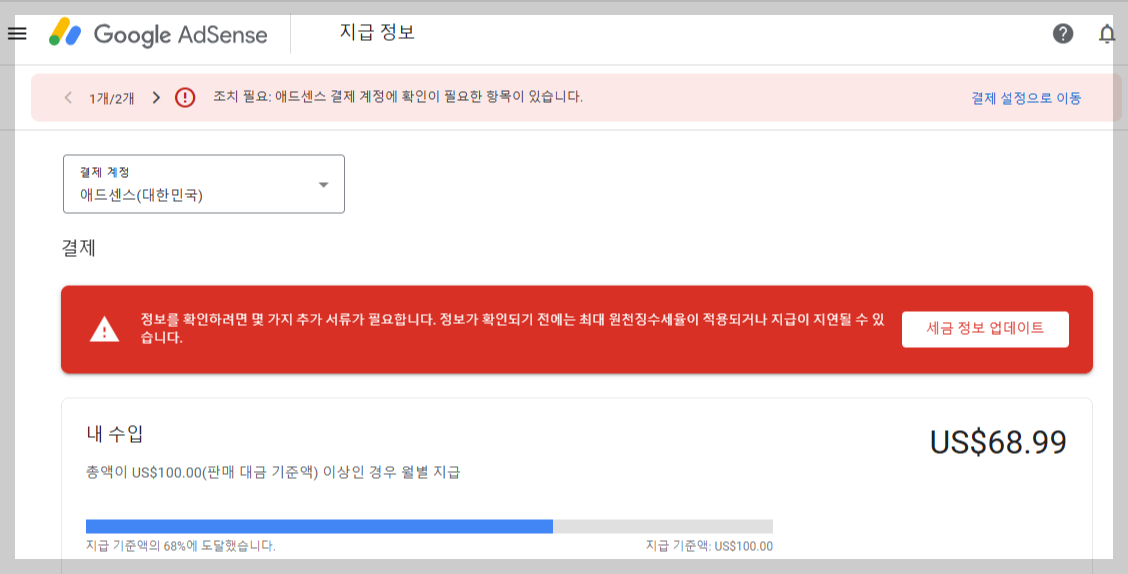 뻘겋게 표시된 부분의 '세금 정보 업데이트'를 클릭합니다.